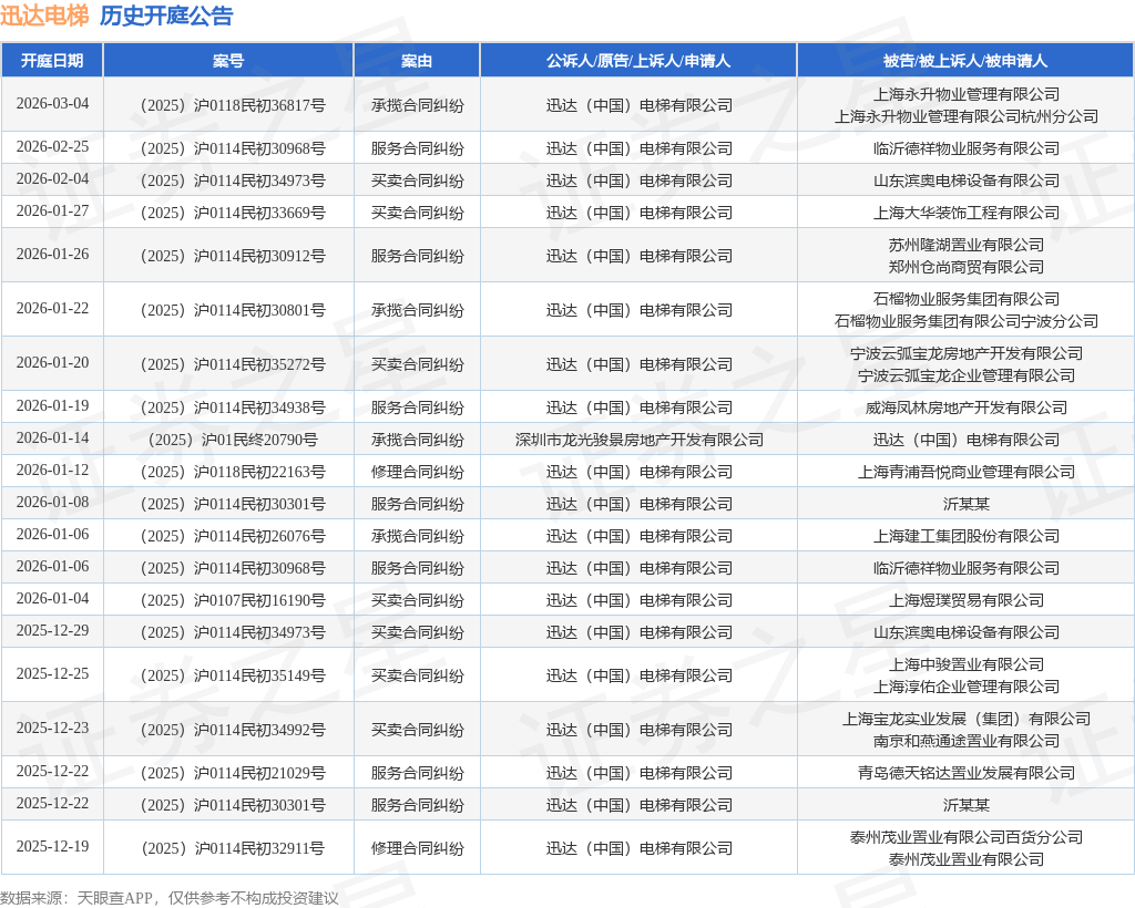 依据计算,近一年内以迅达(我国)电梯有限公司为当事人的前史开庭公告有225则,其间案由为“生意合同纠纷”的公告以134则居首,其次为“承包合同纠纷”有31则,“修补合同纠纷”有16则。前史开庭公告(前20条)如下: